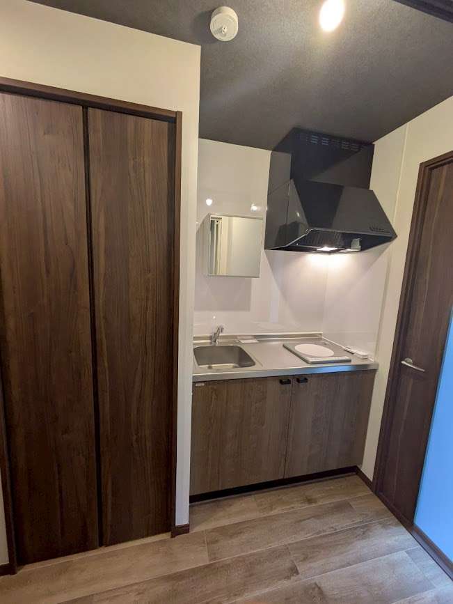 リフォーム後は、木目調のキャビネットとスタイリッシュなブラックのレンジフードを採用し、落ち着きのあるモダンな印象に。IHコンロやスリムなシンクも新調し、限られたスペースの中でも作業がしやすい設計に仕上げています。